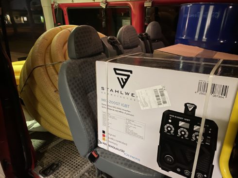 Sebastian Straub besucht uns in der Neusser Privatschule und holt dringend benötigtes Material, Computer+Bildschirme (Vielen Dank an Familie Tilling!) und ein Schweißgerät ab.